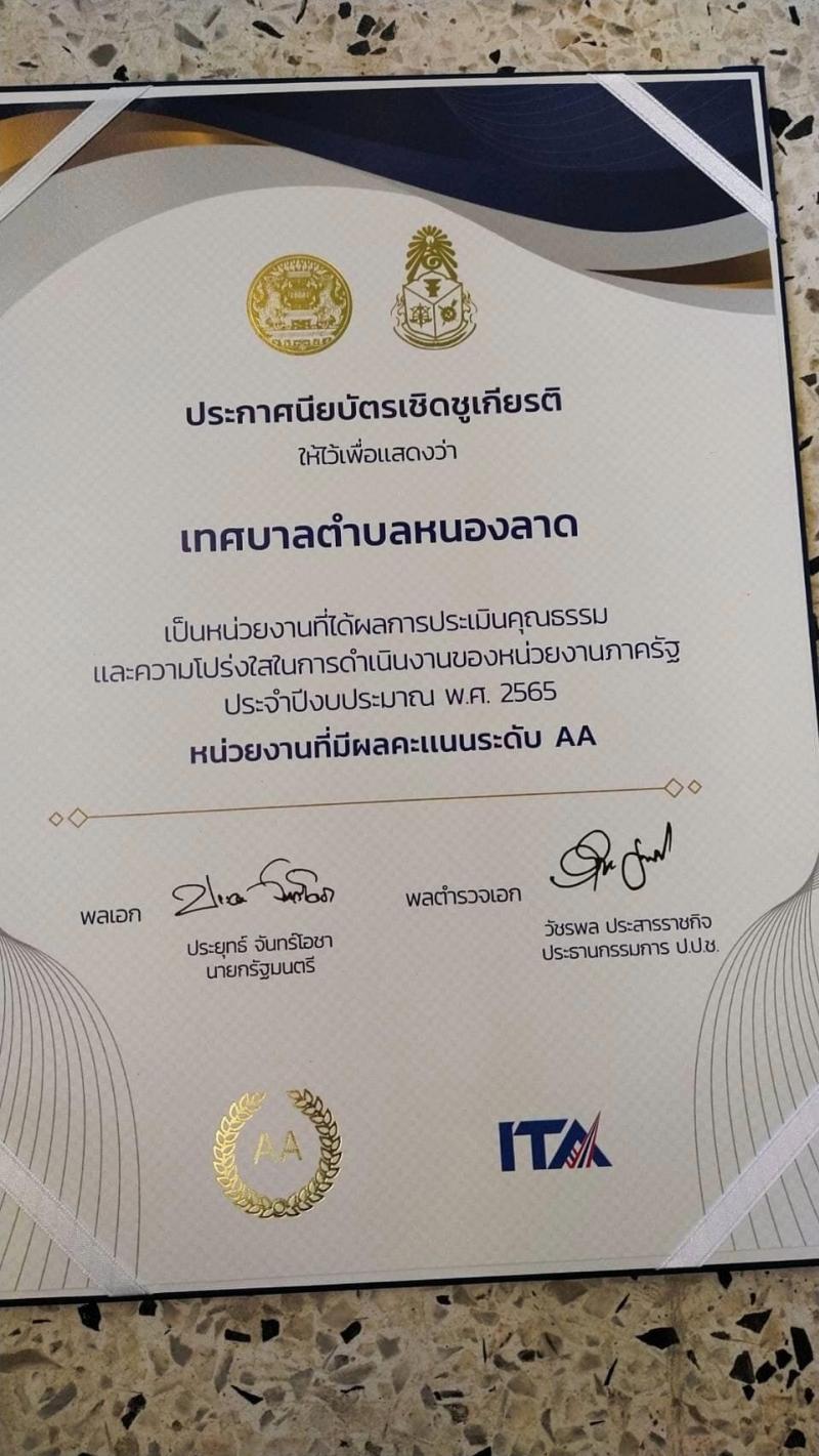 เทศบาลตำบลหนองลาด โดยนายธงชัย เล็กอ่อน นายกเทศมนตรีตำบลหนองลาด พร้อมด้วยนายอนุชา ภิญญะพงษ์ ปลัดเทศบาลตำบลหนองลาด และหัวหน้าสำนักปลัด เข้ารับประกาศนียบัตรเชิดชูเกียรติ เทศบาลตำบลหนองลาด เป็นหน่วยงานที่ได้รับผลการประเมินคุณธรรมและความโปร่งใสในการดำเนินงานของหน่วยงานภาครัฐ ประจำปีงบประมาณ พ.ศ. 2565 (ITA) เป็นหน่วยงานที่มีผลคะแนนระดับ AA