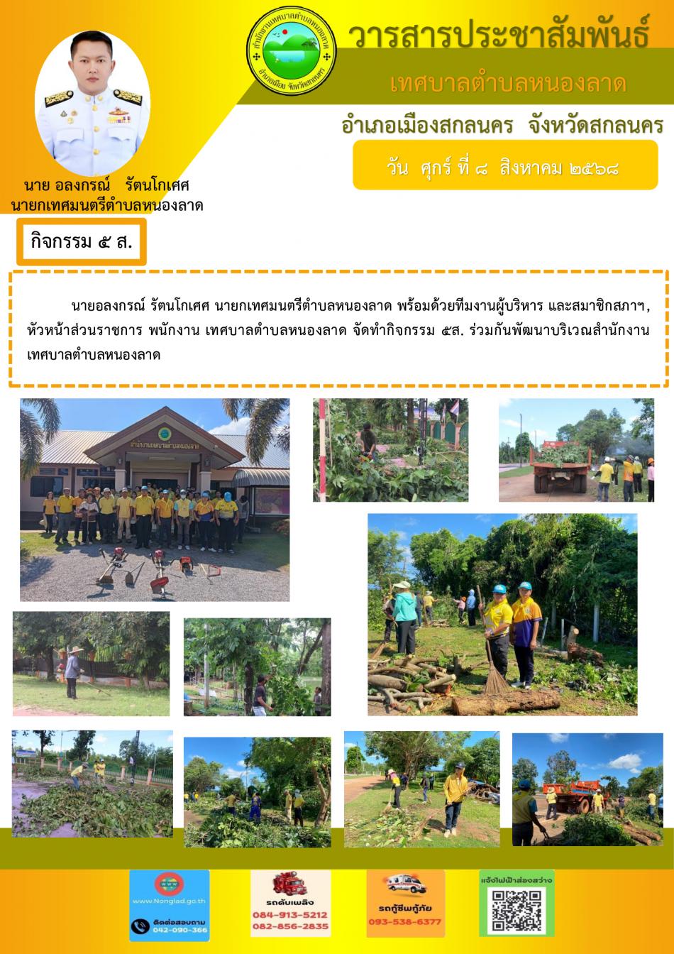 นายอลงกรณ์ รัตนโกเศศ นายกเทศมนตรีตำบลหนองลาด พร้อมด้วยทีมงานผู้บริหาร และสมาชิกสภาฯ,หัวหน้าส่วนราชการ พนักงาน เทศบาลตำบลหนองลาด จัดทำกิจกรรม 5ส. ร่วมกันพัฒนาบริเวณสำนักงานเทศบาลตำบลหนองลาด [8 สิงหาคม 2568]