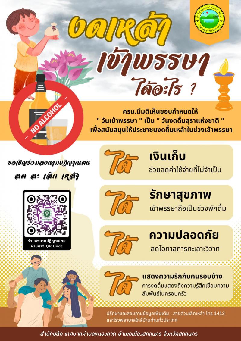 description ด้วยจังหวัดสกลนคร ได้รับแจ้งจากกระทรวงมหาดไทยว่า ในการประชุมคณะกรรมการควบคุมเครื่องดื่มแอลกอฮอล์ ครั้งที่ 7/2567 เมื่อวันที่ 17 มิถุนายน ณ สำนักงานปลัดกระทรวงสาธารณสุข ที่ประชุมฯ ได้มีมติเห็นชอบการจัดกิจกรรมรณรงค์วันงดดื่มสุราแห่งชาติ ประจำปี พ.ศ. 2567 ซึ่งสอดคล้องกับมติคณะรัฐมนตรี เมื่อวันที่ 8 กรกฎาคม 2561 ที่กำหนดให้วันเข้าพรรษาของทุกปี เป็น "วัดงดดื่มสุราแห่งชาติ" และมติคณะรัฐมนตรี เมื่อวันที่ 9 กรกฎาคม 2556 เรื่อง ขอความร่วมมือสนับสนุนกิจกรรมเนื่องในวันงดดื่มสุราแห่งชาติฯ สำหรับในปี 2567 วันเข้าพรรษาตรงกับวันที่ 21 กรกฎาคม 2567 เทศบาลตำบลหนองลาด ขอเชิญชวนร่วมกิจกรรมวันงดดื่มสุราแห่งชาติ ประจำปี พ.ศ. 2567 พร้อมทั้งลงนามปฏิญาณตนผ่านทาง QR Code หรืองระบบลงนามออนไลน์ผ่านทางเว็บไซต์ ช่องทาง Link http://www.noalcohol.ddc.moph.go.th ได้ตั้งแต่วันที่ 1 กรกฎาคม 2567 ถึง วันที่ 17 ตุลาคม 2567 (วันออกพรรษา) person admin