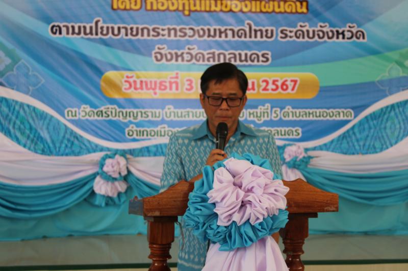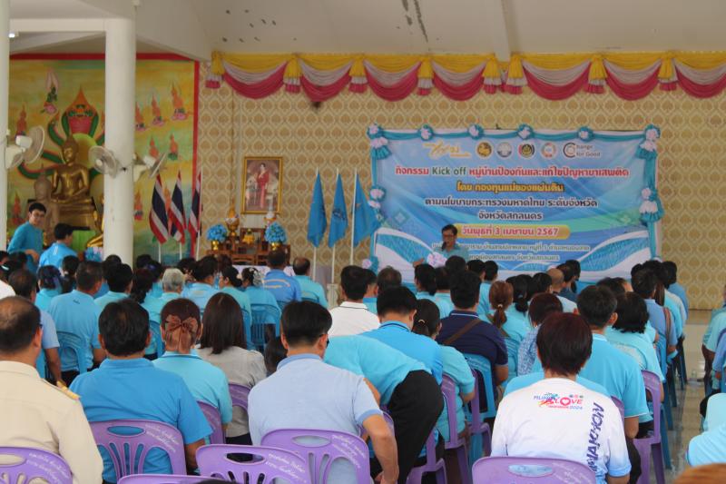 วันที่ 3 เมษายน 2567 เวลา 09.00 น. นายชยุต วงศ์วนิช รองผู้ว่าราชการจังหวัดสกลนคร ประธานเปิดงาน กิจกรรม Kick off หมู่บ้านป้องกันและแก้ไขปัญหายาเสพติด โดย กองทุนแม่ของแผ่นดิน ตามนโยบายกระทรวงมหาดไทย ระดับจังหวัด จังหวัดสกลนคร ณ วัดศรีปัญญาราม บ้านสายปลาหลาย หมู่ที่ ๕ ตำบลหนองลาด อำเภอเมืองสกลนคร จังหวัดสกลนคร